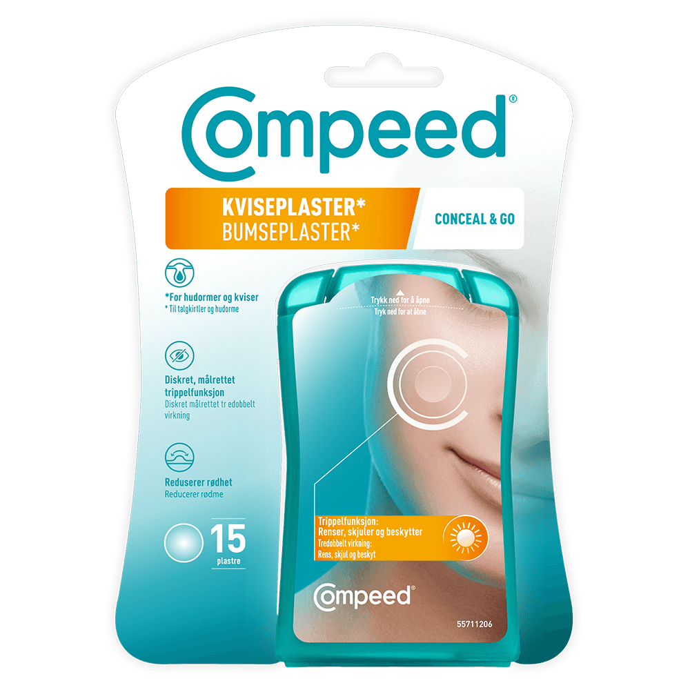 Compeed® Bumseplastre* er designet til at skjule og hjælpe med at reducere effekten af bumser*, herunder sorte hudorme, hvide hudorme og urenheder. Den hydrokolloide teknologi absorberer overskydende talg og udtrækker urenheder for en sund og glat hud. *Hvide hudorme, sorte hudorme og urenheder