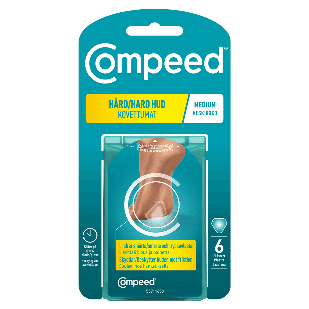 Compeed® Ligtorneplaster er designet til at fjerne ligtorne hurtigt og naturligt. De giver øjeblikkelig trykaflastning og fugt. Compeed® Hård Hud-plastre er designet til at blødgøre og gøre det lettere at fjerne hård hud. De giver et beskyttende og fugtigt miljø, samtidig med at de lindrer tryk og smerter.